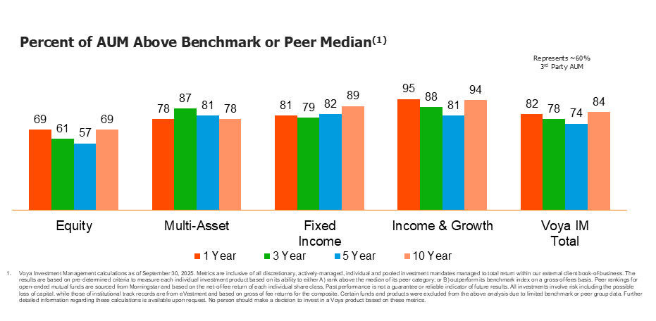 Voya Investment Management calculations as of September 30, 2025. Metrics are inclusive of all discretionary, actively-managed, individual and pooled investment mandates managed to total return within our external client book-of-business. The results